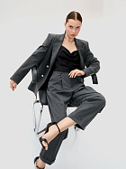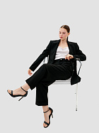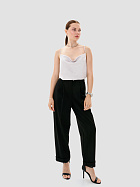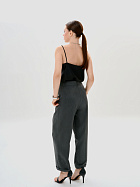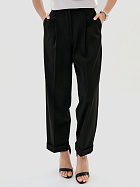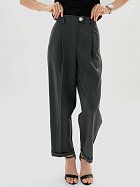 Брюки из костюмной ткани, состав - ПЭ - 69 %; виск. - 28 %; спандекс - 3 %свободного силуэта, зауженные к низу с цельновыкроенными манжетами, с притачным поясом и 5-ю шлевками, с застежкой на тесьму молния, петлю, пуговицу и крючек. На передних половинках складки переходящие в стрелки, боковые карманы. На задних половинках стрелки и имитация прорезных карманов в листочку.