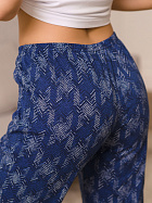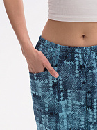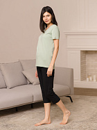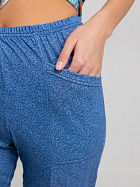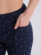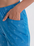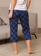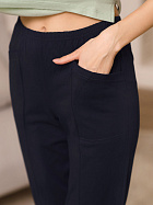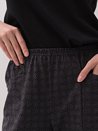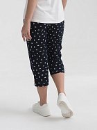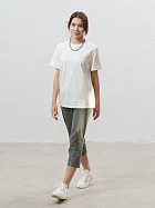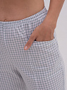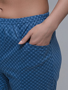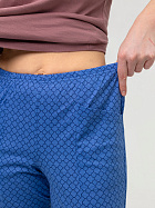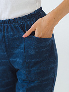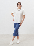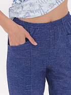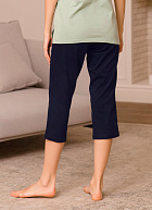 Бриджи длиной до икр. По серединепередних половинок вертикальный рельеф. В боковой части карман с наклонным верхним краем. Пояс цельнокроеный с эластичной тесьмой.