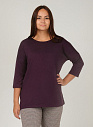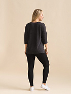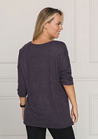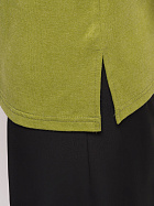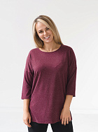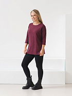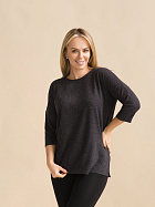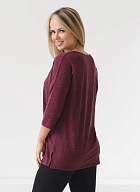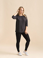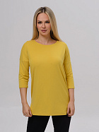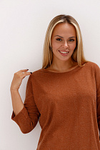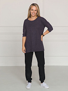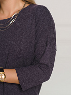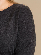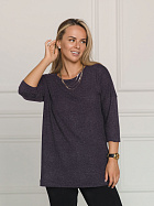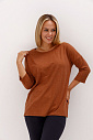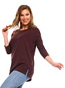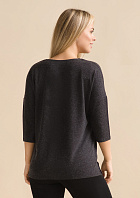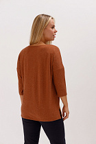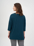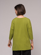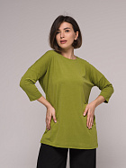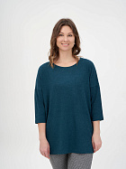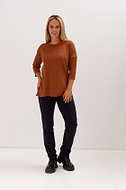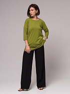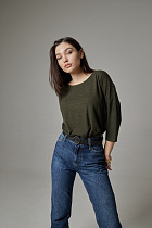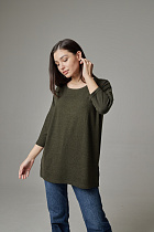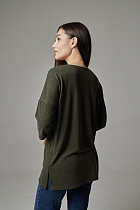 Джемпер удлиненный свободного кроя со спущенным плечевым швом и с рукавом длиной 3/4. Горловина круглая окантована узкой бейкой, которая застрочена внутрь. В боковых швах разрезы.
