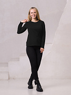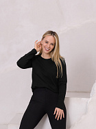 Джемпер слегка полуприлегающего силуэта среднего объема, длина чуть выше линии бедер. Длинный втачной рукав. Круглая горловина обработана узкой бейкой с последующим ее настрачиванием на изнаночную сторону.