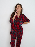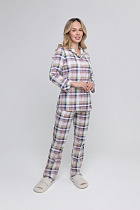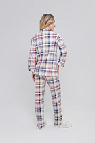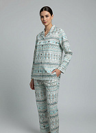 Жакет прямого силуэта среднего объема длиной чуть выше бедер, рукавом 7/8. По низу рукава притачная манжета. Аглийский воротник. центральная застежка на пуговицы. В боковых швах обработаны короткие разрезы. Брюки прямые. Пояс притачной с эластичной тесьмой, с отстрочкой. Карманы закругленные, вход в карман окантован узкой бейкой.