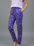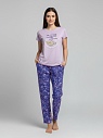 Комплект состоит из футболки и брюк. Футболка прямого силуэта среднего объема со спущенным плечевым швом без рукавов. Горловина круглая обработана узкой притачной обтачкой из основного полотна. Полочка декорирована принтом. Брюки прямые чуть зауженные к низу с цельнокроеным поясом с эластичной тесьмой. Карманы в боковом шве с отделочной строчкой по входу в карман.