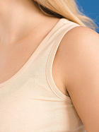Майка прилегающего силуэта U-образным вырезом горловины. Горловина и проймы обработана бейкой из основного полотна.