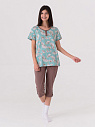 Пижама состоит из футболки и бридж. Футболка прямого силуэта среднего объема с коротким рукавом. Горловина круглая. Полочка с имитацией планки, дкорирована пуговицами. Бриджи прямые. Пояс бридж цельнокроеный с эластичной тесьмой. Карманы в боковых швах с закругленным входом, края подкладки кармана отстрочены. По низу брюк пата, декорирована пуговицами.