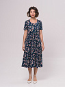 Платье женское полуприлегающего силуэта с раклешение к низу карманами по бокам, круглой горловиной и короткими рукавами.
