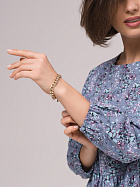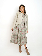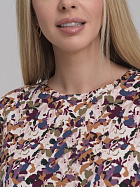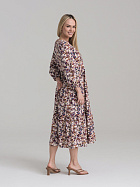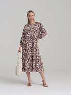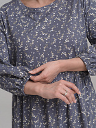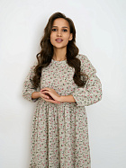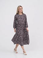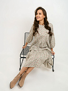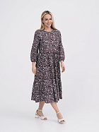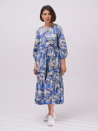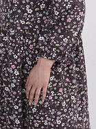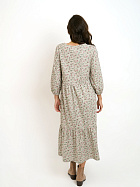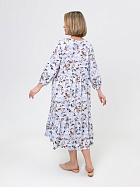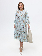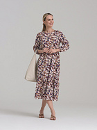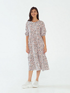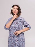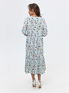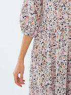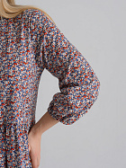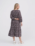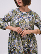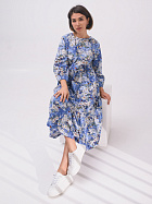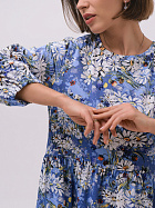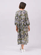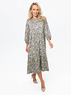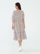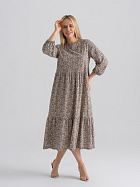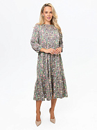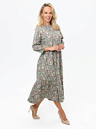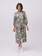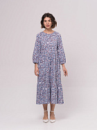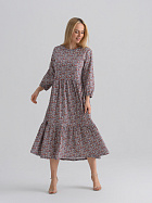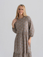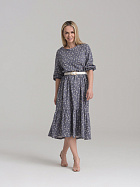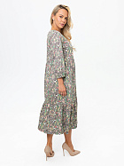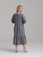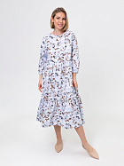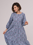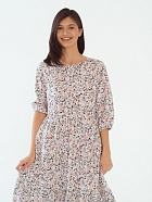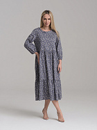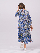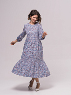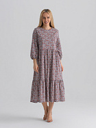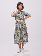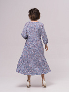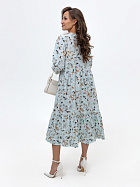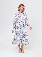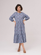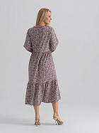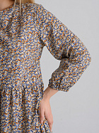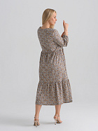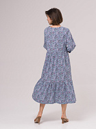 Платье отрезное по талии, лиф платья прилегающего силуэта. Рукава длиной 3/4, по низу приборена на эластичную тесьму. Горловина круглая с притачной обтачкой из основного полотна. Нижняя часть платья расклешенная и с двумя ярусами. Верхние срезы яруса с мягкой сборкой.
