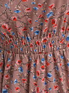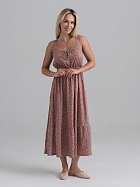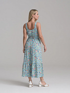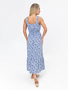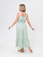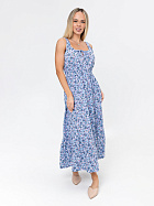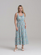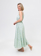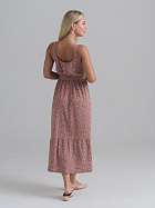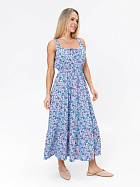 Сарафан длинный, на широких двойных бретелях . Сарафан отрезной по талии, в шов талии проложена эластичная тесьма. Пройма окантована узкой бейкой. На полочке декоративный разрез "капелька" окантован узкой бейкой. Верхние срезы лифа на полочке и на спинке собраны на мягкую сборку и окантованы узкой бейкой, на полочке она переходит в завязки . Нижняя часть сарафана расклешенная с широкой оборкой по низу.
